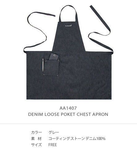高級コーティング処理のストーンデニム素材エプロン☆Stone denim chest Apron Grey (Grey) #AA1407☆ユニフォームデザイナー専門ブランド a.mont☆飲食店・ホテル・サービスユニフォーム(制服)接客・厨房・コックコート・エプロンなどの専門店です♪ ☆a-montエプロン