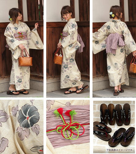 浴衣 セット レディース 浴衣 3点セット(浴衣/帯/下駄)Sサイズ 小さいサイズ プチサイズ 150cm〜160cm 朝顔 ベージュ ピンク 紫 グレー 綿麻 麻混 特選 リネン 先染めベージュ 浴衣セット ゆかた 女性 レトロ 大正ロマン 古典柄 モダン(A)